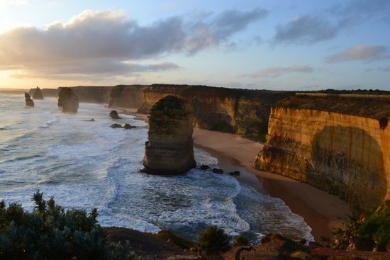 Auf dem Zeltplatz in Koroit legen wir spontan unseren ersten großen Waschtag ein, da es kostenlos und die superdicke 'Caretakerin' besonders nett ist. Allerdings verstehen wir nicht, wozu man die Wäschertrockner hier 'Dryer' nennt. Selbst nach drei Durchgängen passiert da nichts Nennenswertes und so nutzen wir wieder Wind und Sonne zum Trocknen der Wäsche. Die Kinder können am benachbarten Spielplatz toben und klettern und so starten wir erst 15Uhr - nur noch 3h bis zum Sunset. Wir tanken nur kurz in Warrnambool und düsen zur Küste und den Wahrzeichen der Great Ocean Road. Beeindruckende Szenerien und tolles Wetter lassen uns schon in der Bay of Islands schwärmen. Aufgrund der späten Stunde und kurzfristig im Reiseführer gelesenen Empfehlung, den Sunset an den 12 Aposteln zu verbringen, muss es bis dahin im Schnelldurchlauf gehen. Trotzdem erleben wir u.a. die 'London Bridge' mit tosenden Wellen und bei flach stehender Sonne.