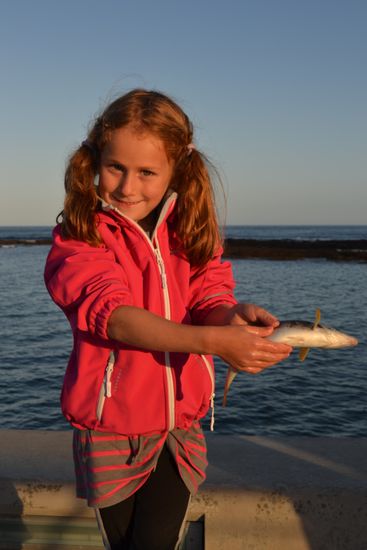 Die Kinder sind nicht mehr wegzubekommen und als die Anglerinnen zum Säubern und Ausnehmen aufbrechen, tragen die Beiden die Fische und Ausrüstung stolz mit. Am Ende staunen sie, was da so alles beim Ausnehmen geschieht. Es ist der größte Spaß mitzuhelfen und die abgeschnittenen und etwas blutenden Fischköpfe zurück ins Meer zu werfen...
