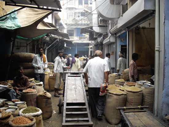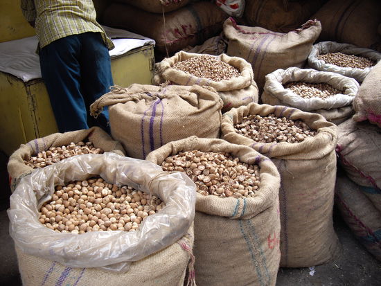 Nach einigem Hin und Her am Spice Market angekommen werden wir gleich von einem Inder "adoptiert", der uns dies und das, das und jenes erklärt, und uns natürlich zum Schluss in seinen Laden führt. Naja macht ja nix. Gebeutelt von Nies- und Hustanfällen durch das Chili und Pfefferpulver in der Luft kämpfen wir uns den Weg durch das Getümmel. Ich habe noch nie so viele Muskatnüsse auf einem Haufen gesehen!