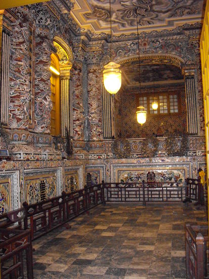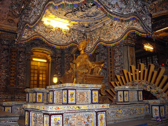 Jetzt lassen wir das Boot hinter uns und fahren weiter zum Mausoleum von Khai Dinh dem "awesome tomb", wie unser Touristenführer es gerne nennt. Es ist auch wirklich sehr sehenswert, auch wenn es im Lonely Planet nicht beschrieben wird. Dieser König hat sich nämlich seine letzte Grabstätte mit wunderschönen Wandmosaiken ausschmücken lassen und auch sonst ist das Ganze sehr prunkvoll.
