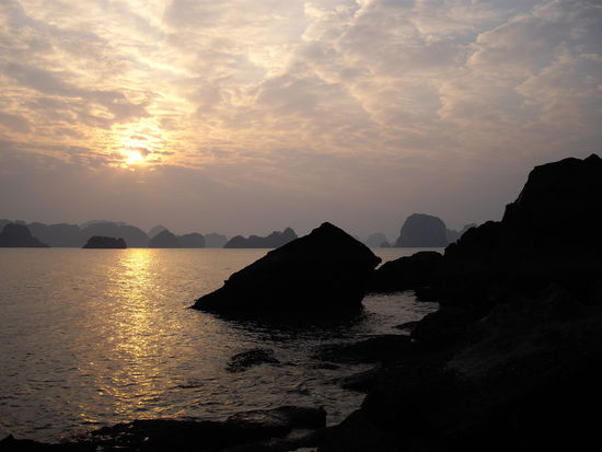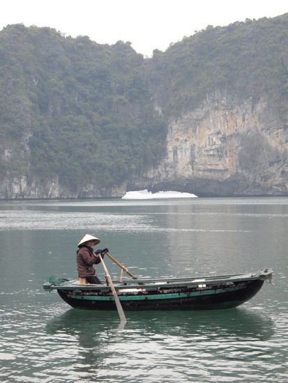 Am 26.12. geht es im Bus nach Halong, von dort weiter aufs Schiff und dann erstmal in eine Bucht getuckert. Dort angekommen eingecheckt in die wirklich schönen Kabinen - vor allem die Dusche hats mir wieder mal angetan. Unser Schiff ist die Aloha Gleich an diesem Nachmittag setzen wir uns ins Kajak und erkunden die Umgebung. Mama und ich haben gleich mal Startschwierigkeiten mit Paddeln und Lenken, aber mit ein bisschen Übung geht das schon. Leider ist Ebbe und wir lassen den kleinen Strand aus, da wir ständig auf Felsen stecken bleiben und es sowieso nicht an Land geschafft hätten. Dafür geht's hautnah vorbei an den majestätischen Felseninseln und den Sonnenuntergang können wir auch ein wenig bewundern - ja die Sonne ist wieder da