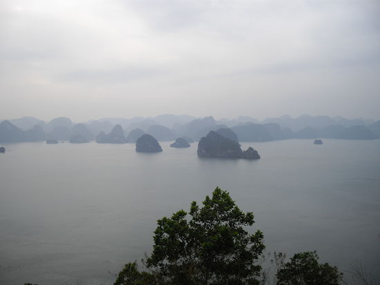 Am 2. Tag sind wir nur zu viert. Claudia und Eduardo aus Argentinien und wir beide erkunden mit unserem Guide Hui (wie das Schlossgespenst ) per Kajak Höhlen und Felsen; Nachmittags geht's rauf auf einen Hügel und die Ha Long Bucht von oben betrachtet. Aufgrund der Wetterlage fällt Schwimmen natürlich aus - viel zu kalt.