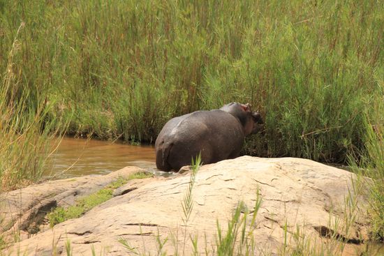 Dieses grosse Hippopotamus wurde wahrscheinlich durch unseren Truck aufgeschreckt. Deshalb rannte es in rasantem Tempo davon und brachte sich in Deckung. Plötzlich hörten wir ein lautes Platschen. Beim Sprung ins Wasser spritzte es auf alle Seiten.
