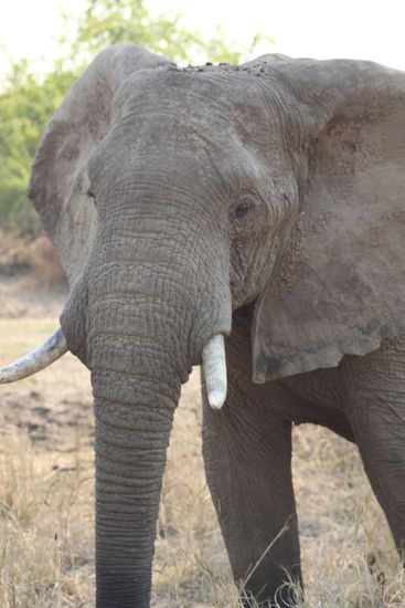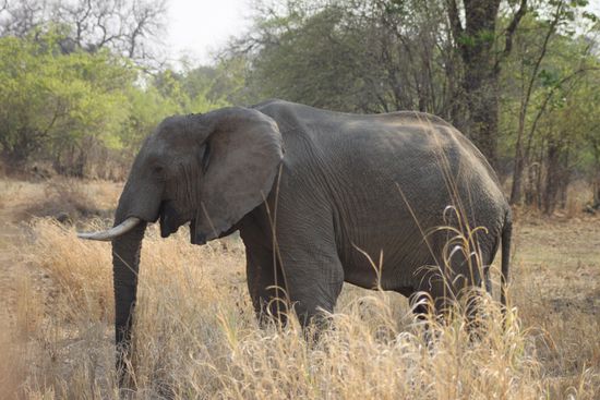 Diese dauerte jedoch nicht lange. Mitten in der Nacht um ca. 2.00 Uhr morgens wurde ich durch ein Geräusch aufgeweckt. Ich schaue aus dem Fenster unseres Zeltes und sehe ca. 3 Meter neben unserem Camp ein Hippo, welches gemütlich das grüne Gras zupft. Weiter hinten unter einem Baum sehe ich einen mächtigen Elefanten stehen. Mir ist diese Situation nicht ganz wohl. Ich wecke Monia auf und wir geniessen dieses eindrückliche Schauspiel.
