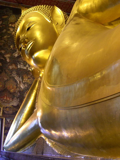 Gleich zu Beginn nahm ich mir die Hauptattraktion vor: den Wiharn des liegenden Buddha. Vorher musste ich meine Schuhe ausziehen und am Eingang deponieren. In einer viel zu kleinen Halle lag eine 16 Meter hohe und 40 Meter lange Buddhastatue. Mein schlaues Buch verriet mir, das sie aus einem Backsteinkern bestand, auf dem die Figur aus Gips modelliert war. Das Ganze war natürlich mit Gold überzogen und ich fragte mich wie viele Kilo es wohl gewesen sein müssen.