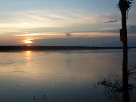 Um sechs geht die Sonne unter und spendiert uns einen grandiosen Sonnenuntergang, am Ufer des Flusses. Ganz schnell wird es jetzt dunkel und es ist ein eigenartiges Gefühl als wir zurück in den Comedor kommen und vergeblich den Lichtschalter suchen. Einzig ein paar Petroleumlampen geben etwas Licht ab. Wir finden bald heraus, dass man dank den Taschenlampen sogar Karten spielen kann. Für's Aufladen der Fotobatterien gibt es den Generator, aber fürs Licht müssen die Lampen genügen.