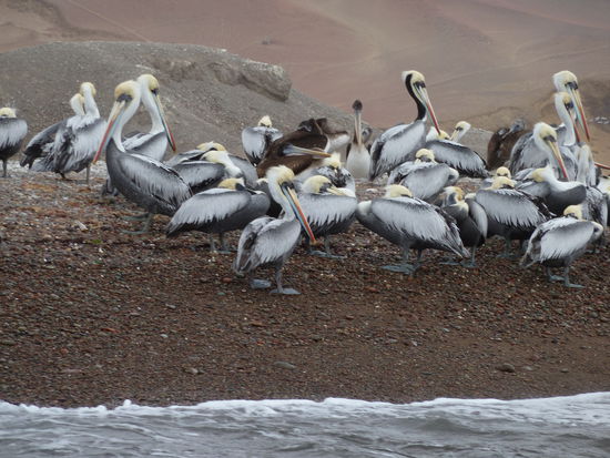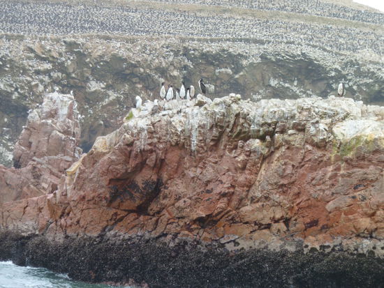 Es sind zwar nur ein paar Felsen im Meer, aber auf ihnen wohnen tausende von Meeresvögeln. Kreischend umkreisen sie die Felsen, lassen sich im Sturzflug ins Meer stürzen um einen Fisch zu schnappen oder sitzen auf den Steinen. Das Wasser schlug an die Felswände, füllte die Höhlen, zog sich zurück und schoss beim Aufschlagen meterhoch an die rauen Steine. Die Vögel blieben unbeeindruckt. Und auch die Seelöwen, die es sich in den Steinen gemütlich gemacht hatten, zeigten keine Regung. Und da unten standen mitten in der tosenden Brandung fünf kleine Humboldtpinguine und kletterten behände zur Wasserkante. Einer nach dem anderen tauchten sie ein. Hoch über uns kreisten die schwarzen Kormorane. Sie fliegen oft in grossen Schwärmen. Der Felsen, auf dem sie wohnen, ist vor lauter Vögel fast schwarz.