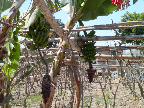 Joel begrüsste uns und wir Frauen waren bald überzeugt, dass wir dem schönsten und charmantesten Vertreter des Hauses gegenüber standen. Er erklärte uns zuerst die Pflanzen, die zusammen mit dem Wein kultiviert werden. Darum sahen wir hier den ersten Bananenstrauch aus der Nähe mit fast reifen Bananen. Daneben ein Papayabaum, der voller Früchte hing. Der Weihnachtsstern rundete das ganze mit seinen tiefroten Blüten ab.