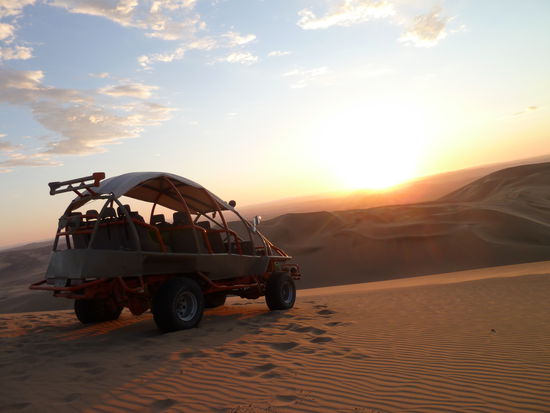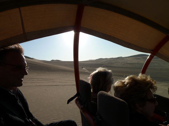 "Treffpunkt halb fünf bei der Rezeption. Zieht geschlossene Schuhe und eine warme Jacke an". Rene und ich hatten uns eine besondere Überraschung ausgedacht. Nicht zu Fuss wollten wir die Sanddüne erklimmen, nein, wir stiegen in einen dieser eigenartiger Sandbuggys. Mit starkem Motor und unter dröhnendem Lärm startete er, fuhr hinauf auf die Krete der Düne und da breitete sich eine unglaubliche Landschaft vor uns aus. Sand wohin das Auge schaute. Es blieb uns wenig Zeit zum Staunen, denn jetzt gab Boris, unser Chauffeur so richtig Gas. Es ging über die Ebene in schlingernden Kurven, hinauf auf die Kreten, hinunter in waghalsigen Schussfahrten. Fast übertönte unser Gekreisch den lauten Motorenlärm.