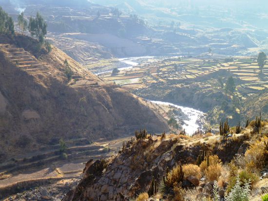 Am frühen Morgen fuhren wir mit dem Bus tiefer ins Colca-Tal hinein. Kaum hatten wir das Dorf Chivay verlassen, wechselte die asphaltierte Strasse zu einer Schotterpiste, auf der wir komplett durchgeschüttelt wurden. Immer wieder fiel etwas von der Gepäckablage. Grössere Sachen wie Rucksäcke konnten wir schon gar nicht oben lassen, Jacken und Pullover musste man immer wieder von neuem nach oben legen. Die Strasse wand sich dem Abhang entlang während der Fluss immer tiefer unten im Tal blieb. Die Ausblicke ins Tal waren gigantisch.
