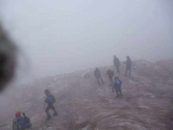 dann gings ab auf den Gletscher .. und auch wenn man mit den Spikes und der Eisaxt guten halt findet ist das ganze ziemlich anstrengend und durch die tiefhaengenden Wolken wurde uns leider die schoehne Aussicht genommen .. war trozdem ein grosser Spass
