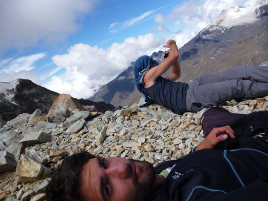 und dann nach dem Mittagessen bin ich mit Rob zusammen ( ohne Gepaeck natuerlich ) ein bisschen hoeher geklettert und haben uns auf den warmen Steinen ausgeruht ... links und rechts riesige Gletscher