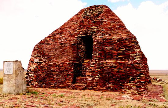 Angekommen am Dombauyl Mausoleum, erblicken wir ein jurtenförmiges Grab, dessen unzählige Steinschichten mit Beton zusammengehalten werden. Mit einer Höhe von sechs Metern trägt das Mausoleum im Herzen der Steppe eines der ältesten Zeugnisse des vorislamischen Lebens in Zentralkasachstan zur Schau. Wann genau dieses - mittlerweile restaurierte - Mausoleum entstand, lässt sich schwer sagen. Einige Archäologen datieren es auf das Hunnenzeitalter (ca. 8. bis 9. Jhd.) und es kursiert die Legende, dass hier der Krieger und Musiker Dombauyl begraben ist, der an Dschingis Khans Hofe beschäftigt war. Dombauyl repräsentiert ein typisches Steingrab (kasachisch: uitasami, dynami), wie es in Zentralkasachstan weitverbreitet ist.