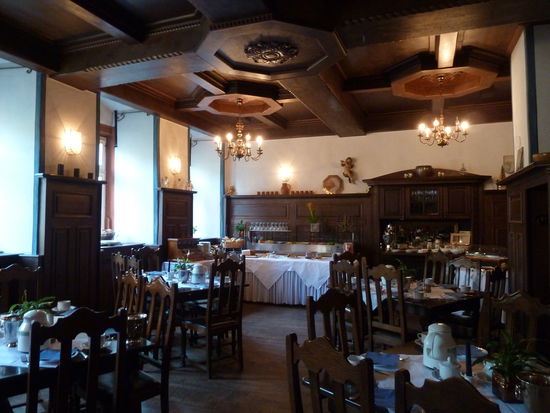 Am nächsten Morgen können wir das sehr schöne Ambiente des Speisesaales zum Frühstück genießen. Einzig sichtbare Kraft ist allerdings wieder die junge Dame vom Vortage.