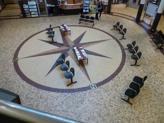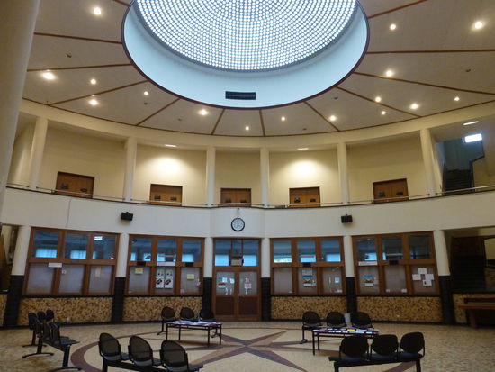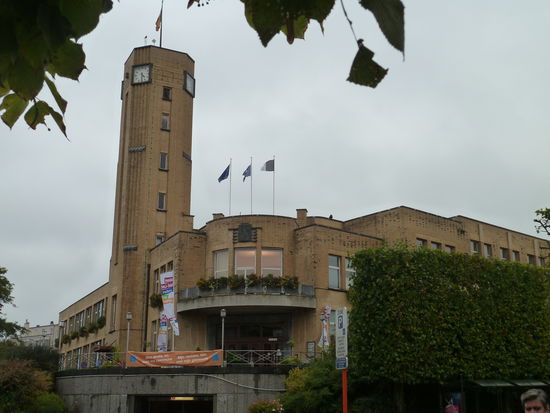 Built between 1937 and 1939 to the design of architect Joseph Diongre, who also designed the famous Belgian Radio & Television Broadcasting Centre at Place Flagey in Ixelles, this austere building combines blue stone and Boom yellow bricks to create a Town Hall which remains a significant example of inter-war architecture by its layout and articulation of volumes. Laid out in the form of a letter L , the right-hand wing is taller, while the left-hand wing has a 30m-high bell-tower located not far from the rounded curve that links the two wings. Inside, the large hall which opens onto the enquiry offices is lit by a brick-and-concrete dome whose design is mirrored on the floor by a compass rose.