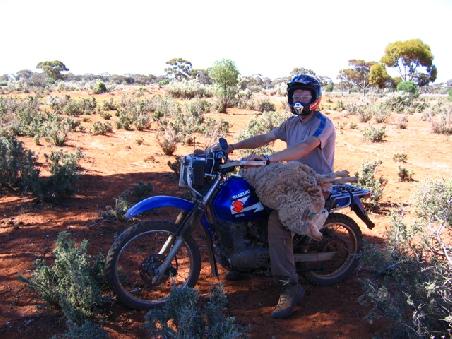 dirt roads viele Kilometer zu den Schafen. Heute mustern (zusammentreiben) wir mit ?Hektar (20km² wenn ich mich nicht irre) ein relativ kleines peddock (Abschnitt/Weide). Einer der Arbeiter fliegt mit dem Flugzeug über das Gebiet und gibt den Leuten auf den Motorrädern Anweisungen. Jeder gibt per Funk seine Position durch und der Pilot gibt die Richtung zu den Schafen an. Wir sind insgesamt 5Leute mit dem Motorrad und versuchen die verstreuten Schafe zu einem großen mob (Herde) zusammen zu treiben.