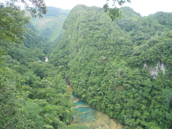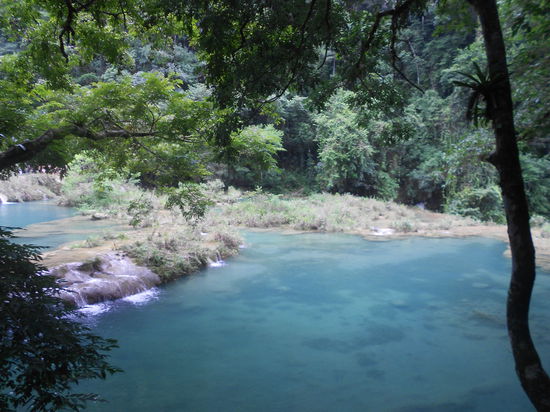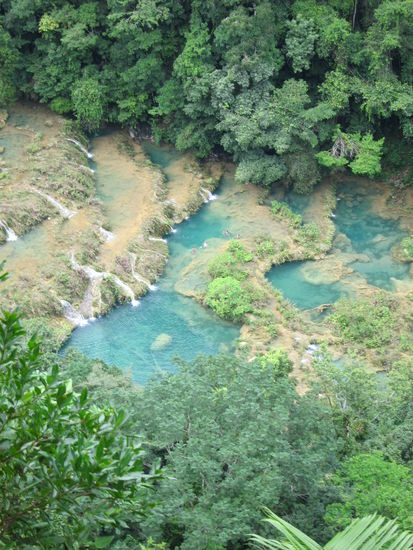 Diese 10 Stunden Busfahrt war wahrscheinlich bisher meine Uebelste. Eingequetscht in einem Bus, der fuer den 1.60 m Durschnitts - Guatemalteken hergestellt wurde, ohne Klimaanlage ging es dann ueber beschissene Strassen nach Lanquin. Nach der Busfahrt waren dann meine Knie schoen wund gerieben vom Sitz vor mir, in dem ein Englaender die ganze Zeit meine Knie im Ruecken hatte .
