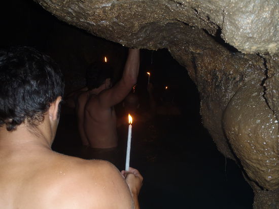 Danach war erneut eine Hoehlenwanderung angesagt - diesmal mit Kerzen anstatt Stirnlampen. Die Hoehle war etwas anderst als in Belize, aber mindestens ganauso cool. Es war wieder schwimmen, klettern, kriechen, rutschen, springen oder durch einen kleinen Wasserfall schwingen angesagt! In der Hoehle dann direkt wieder die Israelis getroffen! War ganz cool, denn die hatten eine wasserfeste Kamera dabei...