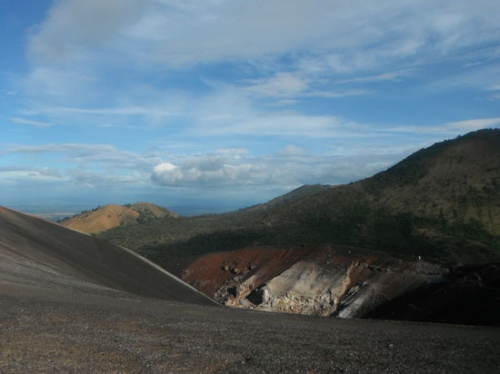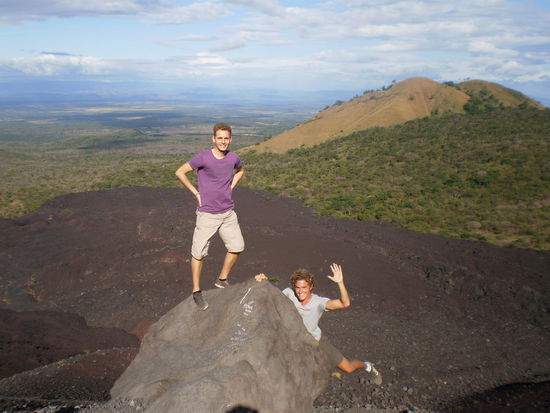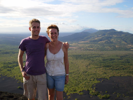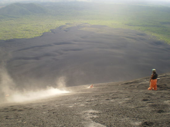 Auf der Ladeflaeche eines umgebauten LKW s gings Richtung Vulkan. Dort angekommen, nahm es uns ein wenig Zeit Mutti zu ueberreden, doch schliesslich kam sie mit. Musste nur ihren Schlitten" hochtragen . Nach einer steilen aber recht kurzen Wanderung kamen wir an den beiden Kratern des "Cerro Negro" an. Der Vulkan, welcher anscheinend recht aktiv ist, eignet sich perfekt zum Sandboarden und wurde schon fuer einige Rekordversuche in Sachen Geschwindigkeit verwendet. Zusaetzlich bietet er eine wunderbare Aussicht ueber eine Vulkankette, sowie den Pazifik.