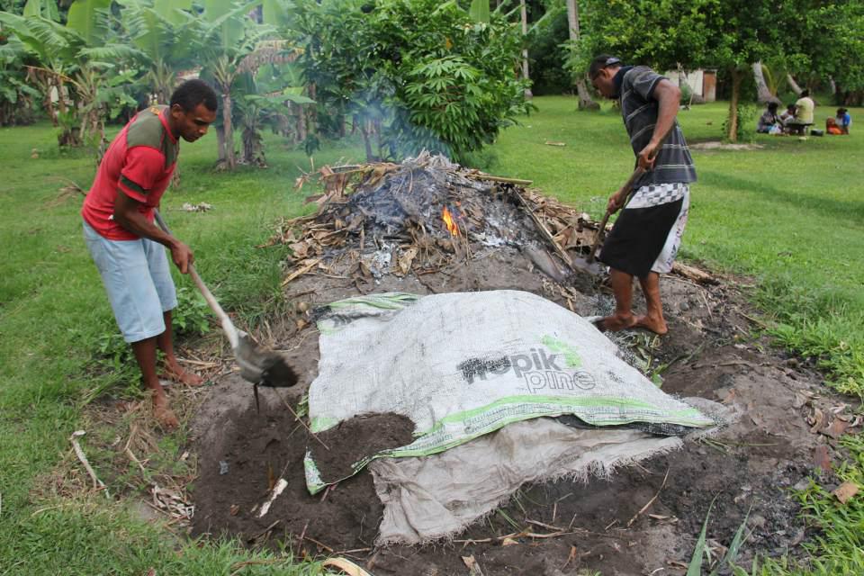 Und weil heute Weihnachten gefeiert wird, wird hier auch besonders gekocht. Sie buddeln ein Loch in den Boden, dann wird Feuer gemacht, damit werden Steine erhitzt und wenn diese richtig heiß sind, wird das Essen in Palmenblätter eingewickelt und diese werden dann auf die heißen Steine gelegt und eingebuddelt. Das Ganze dauert gute 2-3 Stunden. Wir haben Glück das wir das mit machen dürfen, sowas wird wohl nur an besonderen Feiertagen gemacht. Ich bin sehr auf das Essen gespannt!