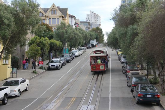 Nun sollte der Relaxtag starten. Auf zur "Cable Car". Wir haben uns für das 1.Day Tagesticket entschieden ( 14 USD ), allein Hin-und Rückfahrt sollten mit der Cable Car schon 12 USD kosten, mit dem Tagesticket kann man dann alles nutzen, schien uns sinnvoller! Nun war anstehen angesagt! An der Powell Street ist sozusagen eine Endstation, wo die Bahn auf einer Drehscheibe gedreht wird. Ist nett mit anzusehen. Die schieben die Bahn praktisch auf die Drehscheibe, lösen die Bremse der Scheibe und drehen die Bahn in die neue Fahrtrichtung! Und los ging es! Wir hatten Glück und konnten draußen (!) sitzen! Ich hätte zwar lieber gestanden, aber das ging jetzt nicht mehr. Spar ich mir für die Rückfahrt Und los gings! Die Bahn ratterte wie verrückt und der "Fahrer" war ordentlich am reißen an den beiden - nenn ich es mal Bedienstangen. Eine ist für das Seil, damit die Bahn praktisch am Kabel im Boden gezogen wird, die andere ist zum lösen. Dann gibt es noch ein Bremspedal. Die Bahn war auf jeden Fall gut am knattern!