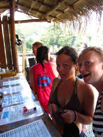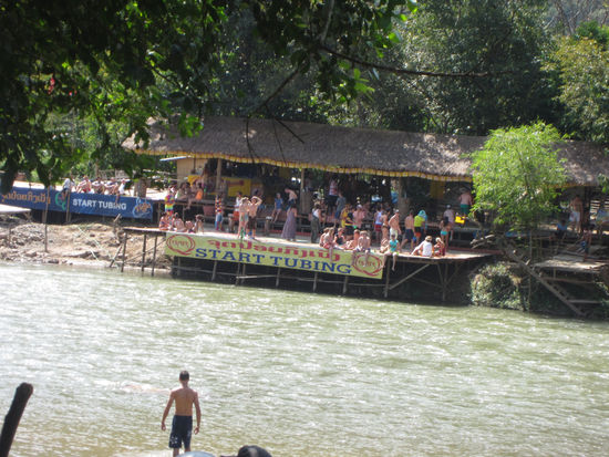 In Vang Vieng bedeutet das aber, auf dem Wasser von Bar zu Bar zu tingeln, mit lauter Musik, unendlich viel Cocktail- Buckets, ueberall bemalten, verkleideten, tanzenden, betrunkenden Menschen, Joints, die z. T. wohl direkt an der Bar ausgegeben werden...nun ja...fast schlimmer/spassiger/ krasser als in der Th Khao San Road.
