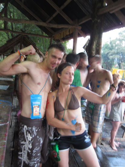 Oh, ja. Naja, diesmal dann wirklich zu viel getrunken (wobei mich Rose - und zig andere - uebertroffen haben) vielleicht auch einen Joint an der Bar angenommen, mich mit Spray und Lackfarbe kraeftig bemalen lassen, ausgiebig getanzt, unendlich viel Spass gehabt, Fuesse im Fluss aufgeschnitten, voruebergehend Schuhe verloren, langfristig Beutel mit Geld und Zimmerschluessel klauen lassen, laenger mit aufkommender Uebelkeit gerungen, usw.. und Rose ist beim Tanzen vom Tisch gefallen.