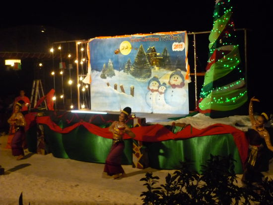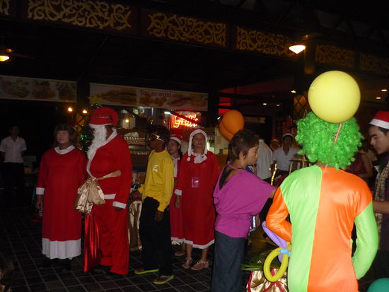 Ihren Hoehepunkt erreichte sie in einer "Transvestiten- Show" - wie es einer der anderen Gaeste nannte - bzw. einer Art Weihnachtsumzug mit einem grell- bunt geschmuecktem Wagen, einem Nikolaus, einem andern Thai- Mann, der als Nikolaus- Frau (?) verkleidet und geschminkt war, begleitet von mit Kugeln behangenen, glitzernden Angestellten, die als Rentiere fungierten und dem Ressort- "mehr als offensichtlich-Homosexuellen" (ich versuche das politisch inkorrekte Wort "Tunte" zu vermeiden), der als Clown verkleidet (??!! warum auch immer) phallische Luftballontiere verteilt hat.