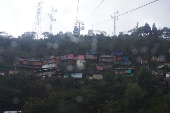 Am naechsten Tag beschliesse ich einen Ausflug, mit der Metro zu machen. Medellin ist Kolumbiens einzige Stadt mit Metro. Sie faehrt ueberirdisch, 35 Kilometer ist ihr Streckennetz, alles ultramodern, sauber und bestens organisiert. Da kommt ein Polizist auf mich zu (ueberall in der Metro stehen Sicherheitsleute herum): "Pass auf die Kamera auf", sagt er, "das ist gefaehrlich hier." Ja ja, ich weiss schon, ich passe auf und fotografiere weiter. In der Bahn betrachten die Menschen den fotografierenden Gringo mit hoeflichem Interesse. Sie scheinen sich zu freuen, dass ein Europaer mit ihnen faehrt. San Javier ist die Endstation, hier steige ich um in die spektakulare Metrocable, eine Seilbahn, die zu den Slums schaukelt, die sich hoch in die Berge hineingefressen haben. Je hoeher, desto aermer. Bald gibt es keine Strassen mehr, die Haueser werden zu Huetten mit Wellblechdaechern. Erst ganz oben in Aurora gibt es wieder richtige Haeuser, 10, 11 Stockwerke hoch, die stark an sozialen Wohnungsbau erinnern. Der Ausblick ist spektakulaer. Das Zentrum von Medellin liegt ganz weit unten mitten in einer riesigen Gewitterwolke. In anderen Teilen der Stadt scheint die Sonne. Dann fallen die ersten Regentropfen, und ich beschliesse, wieder runter zu fahren. Blitze zucken, Donner grollt. Die Metrocable beginnt bedenklich im Wind zu schaukeln. An der naechsten Station, mitten im aermsten Slumgebiet muessen Alle aussteigen. Die Metro stellt ihren Betrieb bis auf Weiteres ein. Muss das ausgerechnet hier passieren? denke ich, etwas nervoes schaue ich mich um, wer hier sonst noch so gestrandet ist. Auffallend viele junge Menschen mit kleinen Kindern. Ein schwarzer Papa von vielleicht 18 Jahten huellt seinen vierjaehrigen Sohn liebevoll in eine Jacke, als der Regen immer weiter in die Station hineinpeitscht. Die Psychologin Lucy hatte mir erzaehlt, dass es in Kolumbien ueberdurchschnittlih viele junge Eltern gibt. Ich hatte das mit Verwahrlosung und Perspektivlosigkeit fuer die Kleinen gleich gesetzt. Doch hier sehe ich nur junge Eltern - selbst noch Kinder - die sich sehr liebevoll ihrer Brut annehmen. Bestimmt erzeugt die junge Elternschaft auch viele Probleme, hier zu sehen sind sie aber nicht. Eine Stunde dauert die Gewitterpause. Als ich wieder einsteige, sitzt eine junge Frau neben mir, die heftig niest und schnupft. Erkaeltung in den Tropen. Auch ich friere und beschliesse nicht laenger als unbedingt noetig in Medellin zu bleiben. Schliesslich bin ich nicht nach Suedamerika gekommen, um verregnetes Schwarzwaldwetter zu haben. Mich beschleicht der Verdacht, dass die Gefahr, sich zu erkaelten hier groesser ist als Opfer eines Raubueberfalls zu werden. In Cali waren es die herunterfallenden Mangos, hier ist es der kalte Regen, der Unheil von oben bringt.