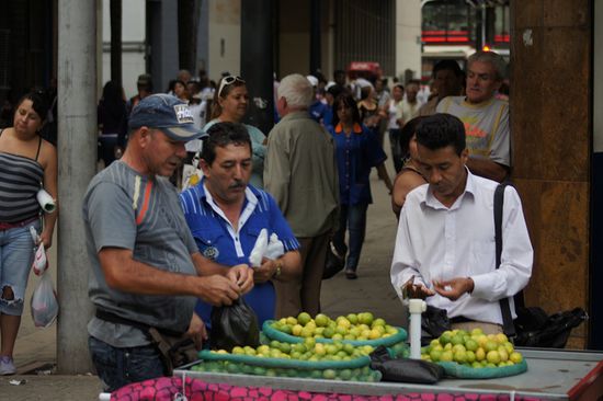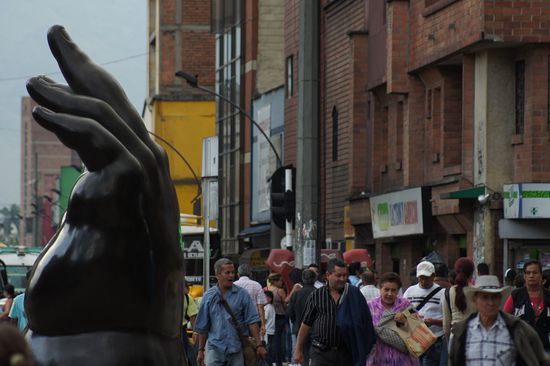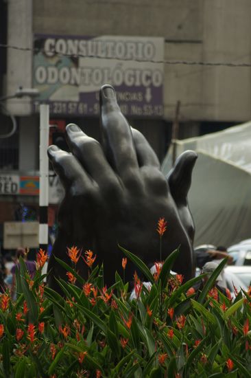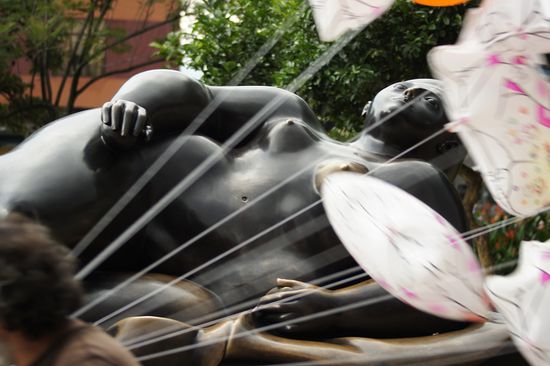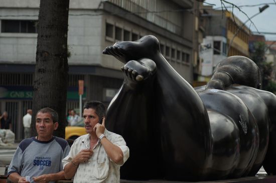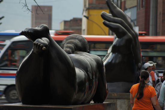 Mein Hotel liegt im Zentrum, ganz in der Naehe der Plaza Botero. 23 Moumentalskulpturen des beruehmten Bildhauers stehen und liegen auf dem Platz rum. Als ich Boteros Werke erstmals in Berlin gesehen habe, dachte ich, dass seine ueberbordenden Frauenfiguren stark ueberzeichnet sind. Nun sehe ich, dass nicht wenige der Bewohnerinnen Medellins einen ganz aehnlichen Koerperbau haben wie Boteros Plastiken...