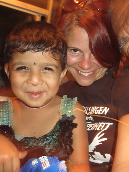 Die Busfahrt nach Omkar dauert ca 2,5 Stunden auf teilweise guten teilweise sehr holprigen Straßen. Ich setze mich wieder mit Buch und Brille rein und versuche abzuschalten. Und dann passiert etwas sehr sehr schönes. Ein kleines Mädchen von der Vorderbank guckt mich lange und sehr beobachtend an. Ich gebe ihr etwas von meiner Schoko ab und das Eis bricht. Sie plaudert und plaudert mit mir, ich verstehe nichts, die Leute um uns herum lachen. Sie singt mir englische und indische Kinderlieder vor und wir spielen lange. Auch die anderen Kinder machen bald mit und zum ersten Mal, werde ich in der Öffentlichkeit nicht als europäische Touristin angegafft, sondern die Menschen lachen (hoffentlich nicht über ) mit mir. Ich wechsle dann aber leider meinen Platz, weil ein Mädchen sich über meinem Rucksack und fast über meinen Füßen übergibt nix passiert, aber der armen gehts wirklich nicht gut. Umso lustiger ist es für alle im Bus, dass die kleine Lady von weiter vorne Küsschen nach hinten wirft und sich dann mit einer Packung Chips auf den Weg macht und ihren Allerwertesten auf meinen Schoß dreht und recht lange bei mir sitzen bleibt und sogar mit mir kuschelt. Der Kassier stempelt sie dann als meine Tochter ab .
