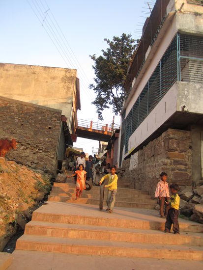Also raus aus dem Ort, über die Brücke, über viele Stufen und nach drei Kilometern sind wir da. Und ich kann es nicht glauben, nach so langer Zeit sehe ich Swami Mangalananda wieder, wir plaudern und plaudern, ich bekomme ein eigenes Zimmer mit Bad (und ich freu mich sogar, dass ich es selber saubermachen kann!), es gibt noch Abendessen und ich werde wirklich Englisch unterrichten. Die Idee sieht so aus, dass ich drei Kinder oder Jugendliche um mich habe und es hauptsächlich um Konversation geht. Manche von ihnen können lesen und schreiben, haben aber keine Übung im Englisch sprechen. Noch sind Diwalifeiertage und am Montag kommen die meisten Kinder zurück. Bis dahin genieße ich mein neues Zuhause, die Insel, die Ortschaft ...