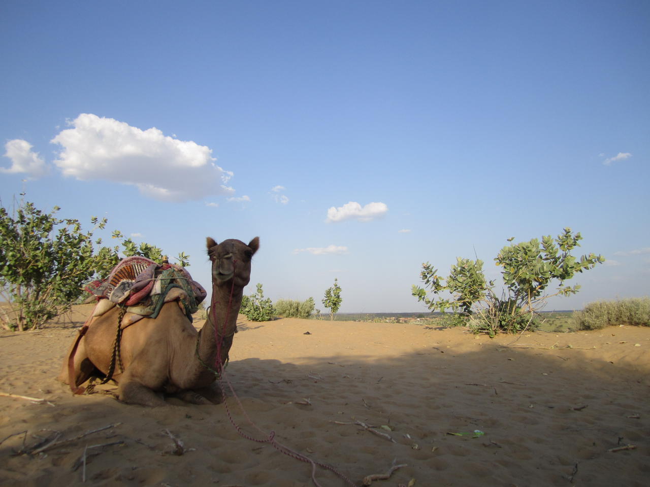 Die A/Cs machen mir mittlerweile zu schaffen. Die Fahrt nach Jaisalmer dauert sechs Stunden. Und es ist einfach zu heiß. Völlig fertig komme ich in der Wueste an, raste ein bisschen und dann gehts ab aufs Dromedar (und die Trompetenkäfer lassen grüßen . Nach dem Sonnenuntergang gibts eine Show mit Musik und Tanz und nach zehn Minuten gebe ich auf. Mich interessiert das Tourileben recht wenig. Ich entscheide mich, in der Wüste zu schlafen und freu mich auf den Mond, frische Luft und keine A/C. Ich kann auch gar nicht mehr zu schmunzeln aufhören, als ich wirklich ein Bett bekomme! Eingestellt auf am Boden schlafen, ergigt das ein recht lustiges Bild. Betten in der Wüste, diese Inder . Die Nacht selbst ist total fein, Sterne, Mond, ein paar Wolken und viel Ruhe. UND es tut sehr gut, sich doch endlich mal mit ÖsterreicherInnen auszutauschen. Ein Pärchen aus Tirol macht die selbe Tour, da steht natürlich Blödeln wie zu Hause auch am Programm!