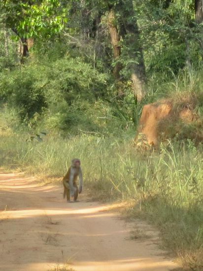 Um 5:30 Uhr werde ich abgeholt, noch auf einen Chai eingeladen und dann geht's ab in den Wald. Schon nach wenigen Minuten sehen wir die ersten Spuren eines Tigers im Sand. Aufgeregt fahren der Besitzer des Offices (der gerade Zeit hat und gleich mitfährt und mir dann viel von sich erzählt ... er singt unter anderem und ist bei irgendeiner Talentshow gerade unter den besten zehn ... Link kommt, also bitte voten!), die zwei Guides und ich weiter. Wir entdecken viel ... von wunderschönen Sonnenstrahlen, die sich durch die feuchte Luft bis auf den Boden kämpfen, dicken Lianen, riesigen Spinnen, Rehen, Wildschweinen, Schakalen, unterschiedlichen Affenarten, Pfauen, Mungos bis hin zu vielen anderen Jeeps und Touristen, die nach Tigern Ausschau halten. Alles nur keine Tiger, von denen sehen wir immer nur Fußabdrücke im Sand . Es geht an diesem Tag jedem so. Pech, schön war's trotzdem und da ich noch einen Tag da bin, probiere ich es am nächsten Morgen noch einmal.Und diesmal werde ich doch sicher Glück haben.