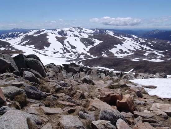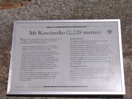 Von Jindabyne besuchen wir den Kosciusko Nationalpark mit dem höchsten Berg von Australien dem Mt. Kosciusko 2'229 m.ü.M. Leider ist das Wetter etwas regnerisch, deshalb beschliessen wir das Bergmassiv zu umrunden, wofür wir über 300 km fahren müssen. Jedoch am nächsten Tag ist das Wetter gut und wir fahren auf den Charlotte-Pass auf 1'835 m. Ab dort geht's zu Fuss, begleitet von Fröschgequake 9 km bis zum Gipfel des Mt. Kosciusko auf 2'229 m. Wir hätten zu Hause nicht erwartet, dass wir in Australien noch durch den Schnee wandern würden!