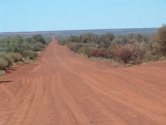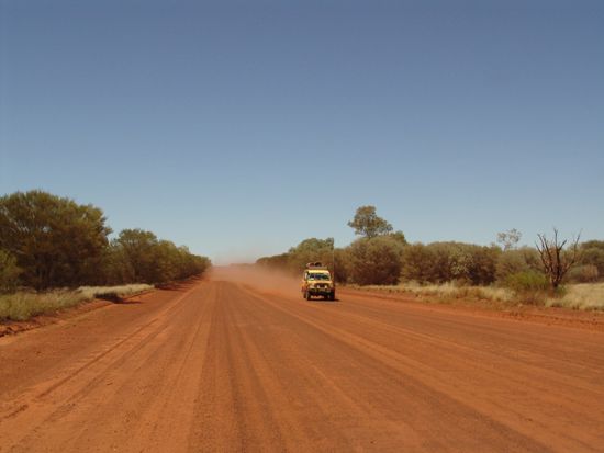 Schon um 05.00 Uhr sind wir wach und hören die Dingos heulen. Nun geht's los über den Tylers Pass bis zum Abzweig Mereenie Loop Road sind es 52 km Schotterstrasse. Danach führt eine 177 km lange Sandpiste zum Kings Canyon, Australiens grösste und tiefste Schlucht. Die Mittagshitze ist gross, deshalb machen wir nur einen kurzen Spaziergang in die Schlucht und kehren zum Auto zurück. Übernachten wollen wir in dieser Gegend nicht, da die Preise sehr touristisch sind. Da der Himmel wolkenlos ist und für Morgen auch bleiben wird, fahren wir weiter und erreichen nach 67 km den Lasseter Highw., welcher uns zurück zum Ayers Rock führt.