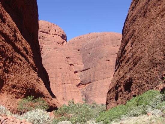 Anschliessend fahren wir zur Gebirgsformation 45 km Kata Tjuta (Olgas) und freuen uns am Frühstück in unserem Auto mit Blick auf die mächtigen Felskuppeln. Auf der Rundwanderung durch das Valley of the Winds (7km) und zur Olga Gorge (2 km) erleben wir die Beeindruckenden Proportionen der Olgas und beginnen zu verstehen, dass die lokalen Aboriginals das Gebiet noch immer als Ehrfurcht einflössend empfinden. Im Schatten eines Baumes bei 35 C erwarten wir den Sonnenuntergang am Uluru und auch hier werden wir von dem Schauspiel nicht enttäuscht. Bei Nacht fahren wir zurück zu unserem Campingplatz und legen uns todmüde schlafen.