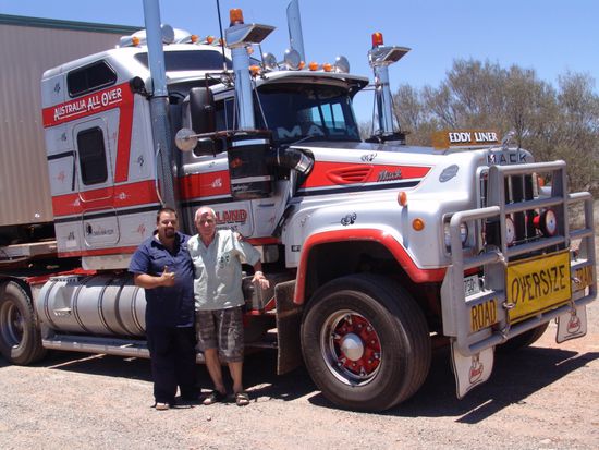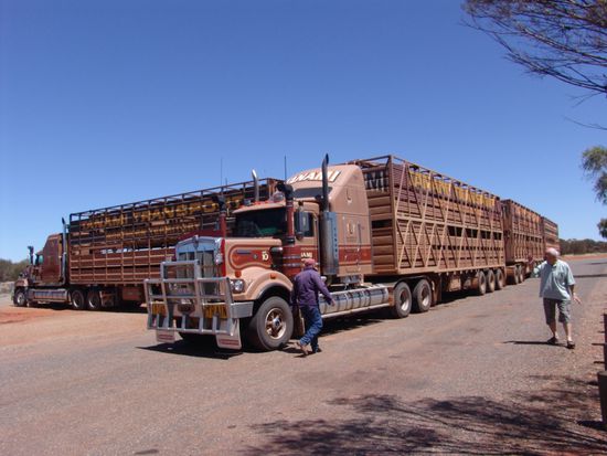 Wir fahren zurück auf den Stuart Hwy. wo uns ein Road Train mit Überbreite überholt. Wir drücken uns ganz auf die linke Strassenseite und lassen den endlosen Zug vorbeiziehen. Das Gespann fährt mit über 100 km/h und der letzte Anhänger schaukelt bedenklich hin und her. Beim nächsten Parkplatz für Road Trains steht das Gespann und wir fahren hin und fragen den Chauffeur, ob er uns Touristen einige Fragen beantworten würde. Der König der Strasse ist sehr freundlich und erzählt uns folgendes: