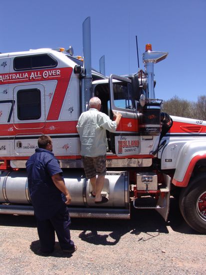 Das Gespann ist 54 m lang, hat 16 Achsen mit insgesamt 62 Rädern. Die Zugmaschine hat ein automatisches Getriebe und der Motor hat 600 PS und kann 4x500 Liter Diesel tanken. Peter darf sogar in die Führerkabine steigen und der Chauffeur erzählt dass schon sein Grossvater und Vater als Chauffeure von Road Trains gearbeitet hätten.