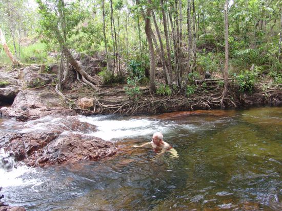 Von Darwin müssen wir wieder zurück fahren nach Katherine. Unterwegs machen wir halt im Litchfield NP, wo die Vegetation üppig-tropisch ist. Charakteristisch sind die grossen Termitenhügel. Es handelt sich dabei um Kompasstermiten, die ihre Bauten streng nach der Sonnenstrahlung in Nord-Süd-Richtung ausrichten. Die bis zu vier Meter hohen "Bergsäulen" sind eindrucksvolle Fotomotive. Im ganzen Park laden Wasserfälle und natürliche Pools zum krokodilfreien Baden ein. Es ist sehr heiss und schwül, so dass wir die ganze Nacht einfach daliegen und "schwitzen lassen"!!!