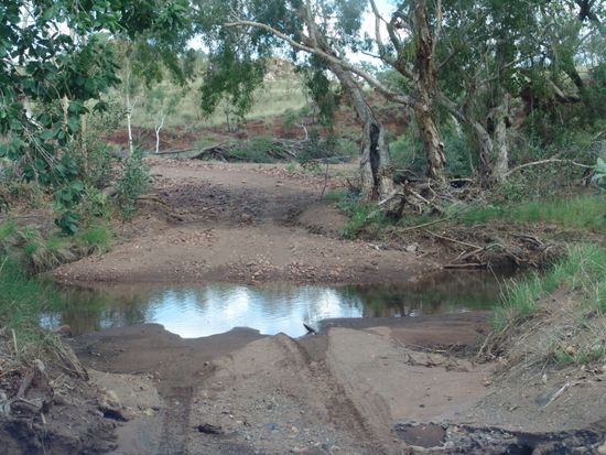 Auf der Gibb River Road fahren wir bis zur Stelle, wo der Pentecos River überquert werden muss. Die Furte ist etwa 100 m breit und zurzeit 60 cm beträgt der Wasserstand. Wir haben Glück, bei unserer Ankunft kommt gerade ein Auto mit Anhänger durch die Furte und so können wir gut abschätzen, ob es für unser Auto auch machbar ist!