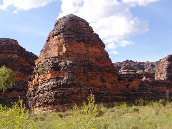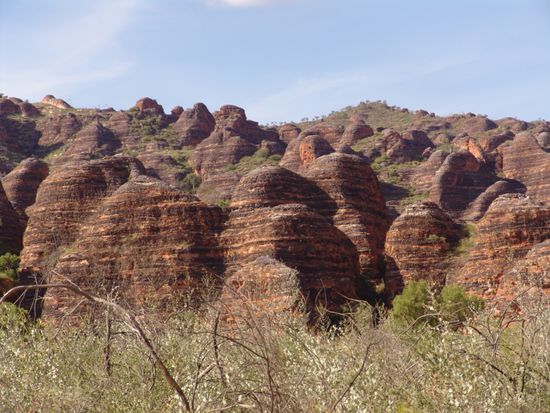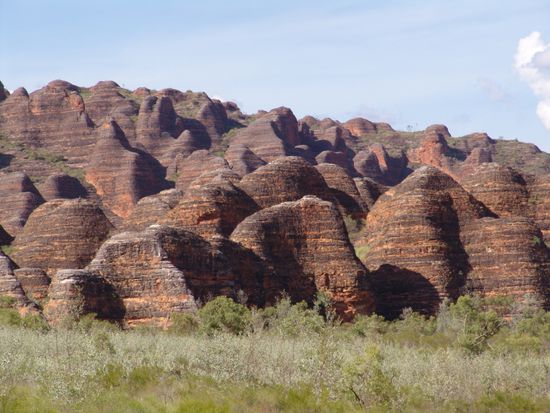 Unser nächstes Ziel ist der Bungle Bungle NP, mit 20'900 qkm einer der eindrucksvollsten Landschaften Westaustraliens. Die Zufahrt ab dem Hwy. ist 53 km lang und nur mit Allradfahrzeugen zu befahren. Die Strasse ist mehr ein Bachbett und wie auf einer Achterbahn geht's von Furte zu Furte mit und ohne Wasser! Wir fahren sorgfältig und erreichen nach 3 Std. das Visitor-Center im Park. Bei Sonnenuntergang und grosser Hitze geniessen wir die Orange-schwarz gestreiften Sandsteindome, die wie riesige Bienenkörbe aussehen.