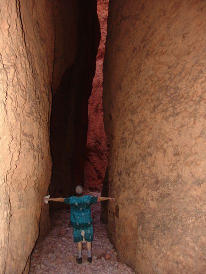 Nach einer heissen Nacht fahren wir zu der spektakulären Echidna Chasm. Ein 2 km langer Weg führt durch eine immer enger werdende Felsspalte. Zum Teil stehen die 100 m hohen Felswände nur einen Meter auseinander. An dieser Stelle strahlt die Sonne nur eine Stunde am Tag hinein und taucht die Spalte in ein geheimnisvolles Licht. Danach treiben wir unser Auto wieder auf der holprigen Piste zurück auf den Victoria Hwy.