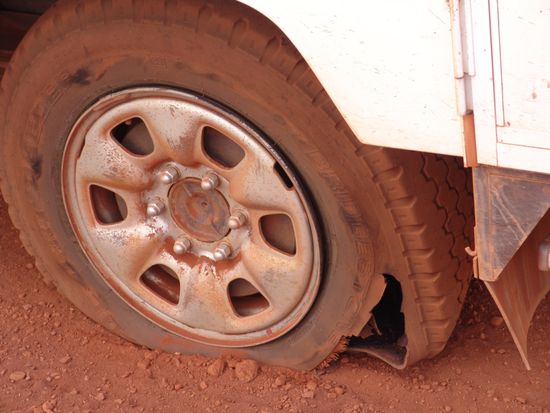 Der Karijini NP ist 6274 qkm gross, bietet viele rotleuchtende und steile Schluchten mit Wasserfällen und Pools. Wegen der grossen Trockenheit sind jedoch zurzeit die Wasserfälle ausgetrocknet und die Pools nur noch brackige Pfützen. Es ist sehr heiss, was uns nicht gerade zum wandern ermuntert. Unterwegs auf der Piste haben wir eine Reifenpanne. Zum Glück ist Peter vom Fach und weiss wie den Wagenheber zu bedienen und das Reserverad hinunter zu nehmen. Es ist eine harte Arbeit bei der Mittagshitze und den vielen Fliegen, aber Peter löst das Problem bravurös!