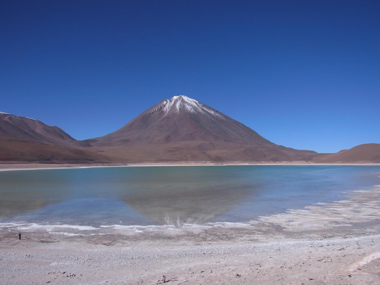 Die Sonne knallt vom strahlend blauen Himmel und am Horizont spiegeln sich die Berge ganz eigenartig, was wiederum nur geht, wenn Wasser auf dem Salz ist.