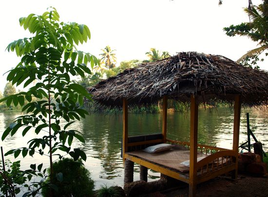 Auf nach Alleppey, dort hab ich "ein ruhiges Plätzchen" gebucht. So geht es vom Bahnhof ertmal ein paar Kilometer raus aus der Stadt und dann ist Schluß mit Straße. Mein Fahrer erklärt mir, daß der Rest des Weges nur zu Fuß zurückgelegt werden kann. Aber er bringt mich hin und so laufen wir noch gut einen Kilometer einen kleinen Pfad direkt am Wasser lang. Ich überlege, oh je was hast du da eigentlich schon wieder gebucht Dann sind wir da - mitten im Paradies - ein kleines Bungalow, mit Terasse die bis direkt ans Wasser geht. Vor mir die unzähligen kleinen Kanäle der Backwaters und drum herum nix als Palmen und Wald. So läßt sich´s leben. Dazu noch eine Liege, die wie ein Steg übers Wasser reicht - das ist definitiv mein Platz. Hier lieg ich rum, trinke Tee und schaue den kleinen Reiskanus zu die übers Wasser schippern. Bis es langsam dunkel wird, die Moskitos geifen an, aber ich weiß mich zu wehren Nachts hört man hier nur das Plätschen des Wassers und alle Arten von Tieren, Vögel, Affen, Grillen, Frösche und keine Ahnung was da noch alle so lebt.Und für mich wirds Zeit ins Bett zu gehen.