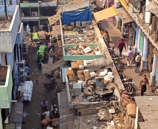 Delhis Gewürzgroßmarkt von oben - in jedem dieser kleinen Eingänge und drum herum wird Ver- und Gekauft was das Zeug hält