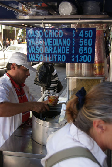 Vaso sieht seltsam aus und schmeckt fantastisch!Das sind Weizenkerne in einem Pfirsich-Saft und das Nationalgetränk Chiles.