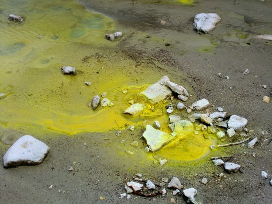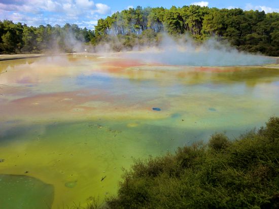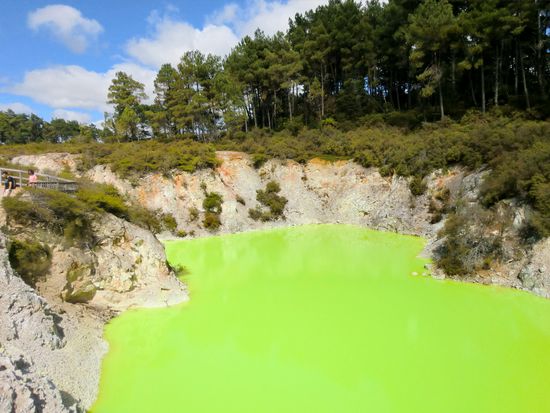 Nach einer Nacht in der Parkbucht am wunderschönen, dünengesäumten Strand am Ende einer "verlassenen Stadt" (Corinna wollte mir ständig Schauermärchen erzählen: Das ist hier genau wie in meinem letzten Tess Gerritsen Buch...Horror) und etlichen Strafjägermeistern nach verlorenem Kniffelspiel, ging es am nächsten Tag weiter nach Süden Richtung Rotorua, direkt auf den Parkplatz vom Wai-O-Tapu Thermal Wonderland, mit dem Plan, am nächsten Morgen vor dem Touristenansturm in aller Frühe den Park zu besichtigen. Der Plan ging nicht auf. Da Jan sich morgens beim Laufen im Urwald verirrte und erst nach ca. 2 h vom Milchlaster gerettet wurde, trafen wir gegen 10:30 Uhr mit allen Touristenbussen ein und mussten ein bißchen trixen um noch ein einsames Naturerlebnis zu bekommen. Man Laufe einfach den Rundweg gegen den Strom : )