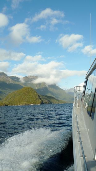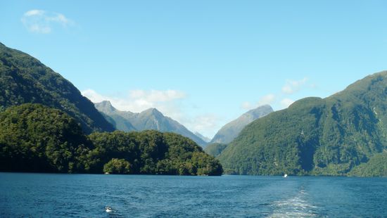 Am Tag nach dem Regen haben wir die Tour durch den Doubtful Sound gebucht, der eigentlich kein Sound sondern ein Fjord, also durch Gletscherfluss entstanden ist. Auch diesen hat James Cook benannt, da er es für zweifelhaft hielt, ob er aus dem Hafen wieder hinaussegeln könnte. Die Geschichte war mal wieder ganz schön teuer, aber zugegeben, wir mussten erst eine Stunde über den See schippern, dann eine Stunde mit dem Bus durch die Hügellandschaft und darauf die dreistündige Rundfahrt durch den Fjord. Dieser war traumhaft schön, mit 700 m hohen Wasserfällen und eingeschnitten in die Felsen. Laut Maorilegende hat der mir entfallene Hauptgott damals alles hier mit einer Riesenaxt kurz- und kleingehauen und so die Landschaft geformt. Allerdings macht so viel Landschaft ansehen auch müde, zumindest Ben und mich.